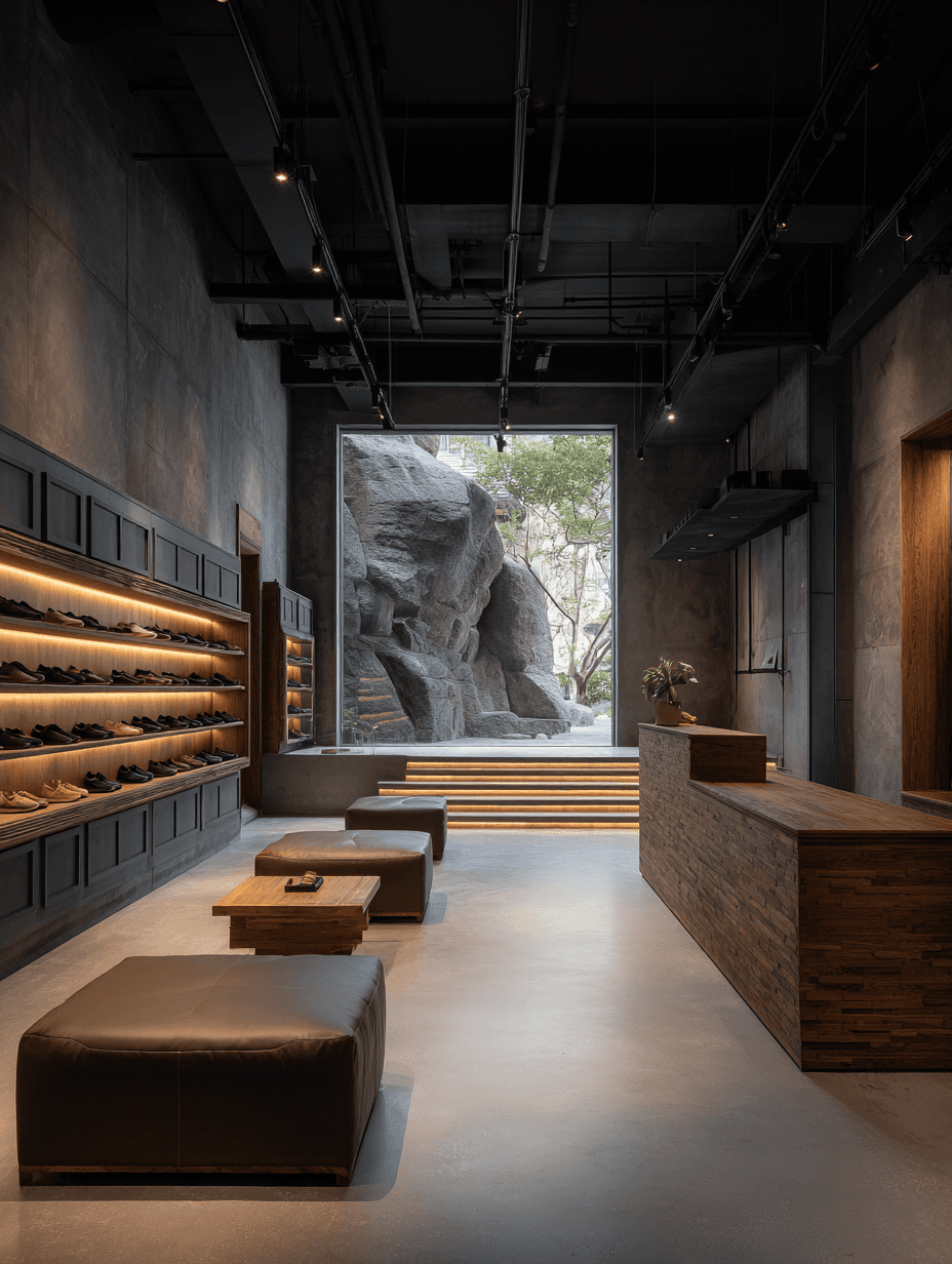 MUK-HUIは、切り立った岩肌の力強さと清水コンクリートの洗練が共鳴する、洞窟のような静謐な展示空間です。韓国の伝統的な空間美学である「空(コン)」の概念を現代的に解釈。計算し尽くされた光と影のコントラストの中で、最高峰の職人技が宿る鞋履を一足ずつ、まるで彫刻作品のように際立たせます。